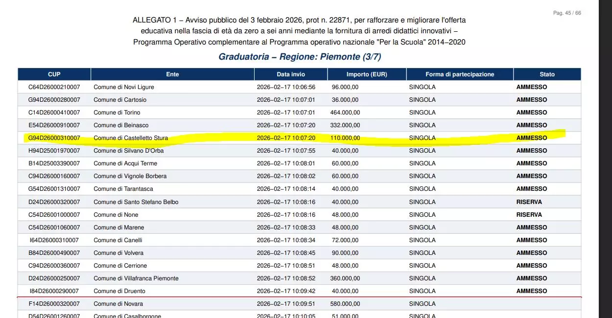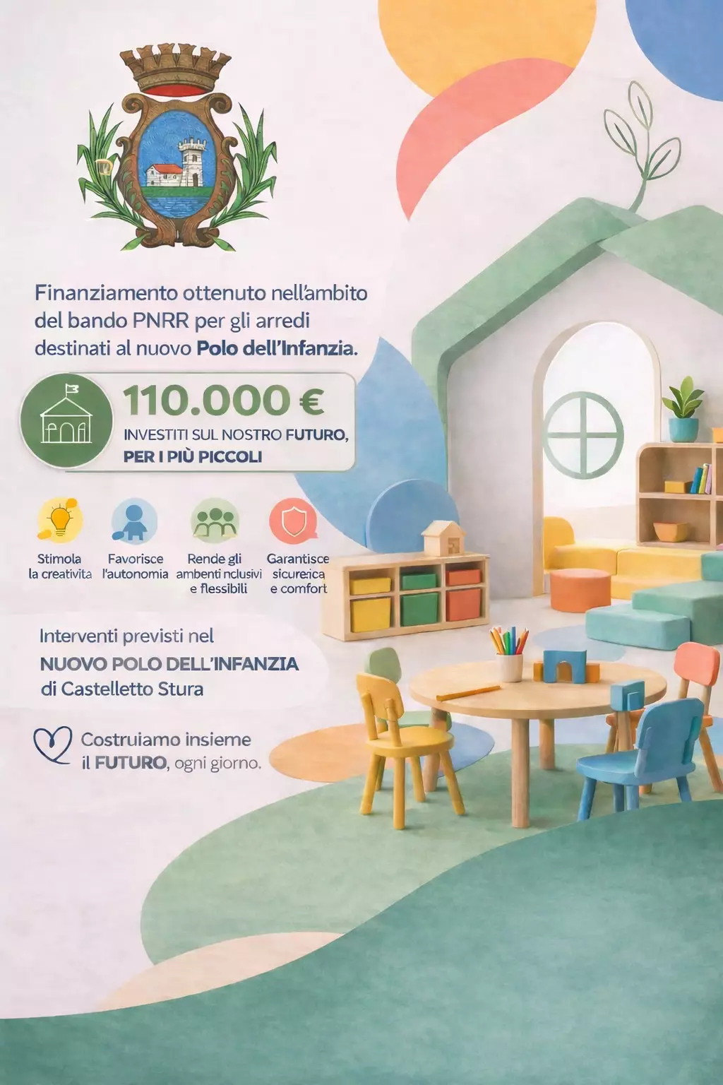 “Un ulteriore importante risultato per la comunità di Castelletto Stura. L’Amministrazione Comunale annuncia di aver ottenuto un finanziamento pari a €. 110.000,00 nell’ambito del bando PNRR destinato agli arredi per asili nido e scuole dell’infanzia.