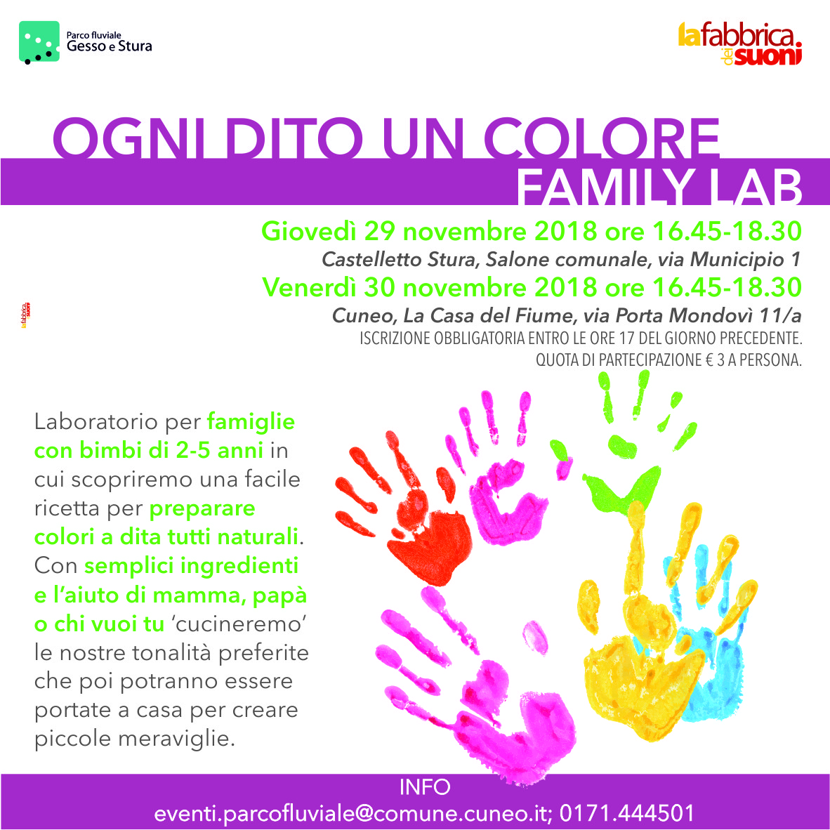 Dettaglio Nella giornata di giovedì 29 novembre, presso il nostro comune, si terrà un laboratorio per famiglie con bambini dai 2 ai 5 anni, in collaborazione con il Parco fluviale, chiamato "Ogni dito un colore".